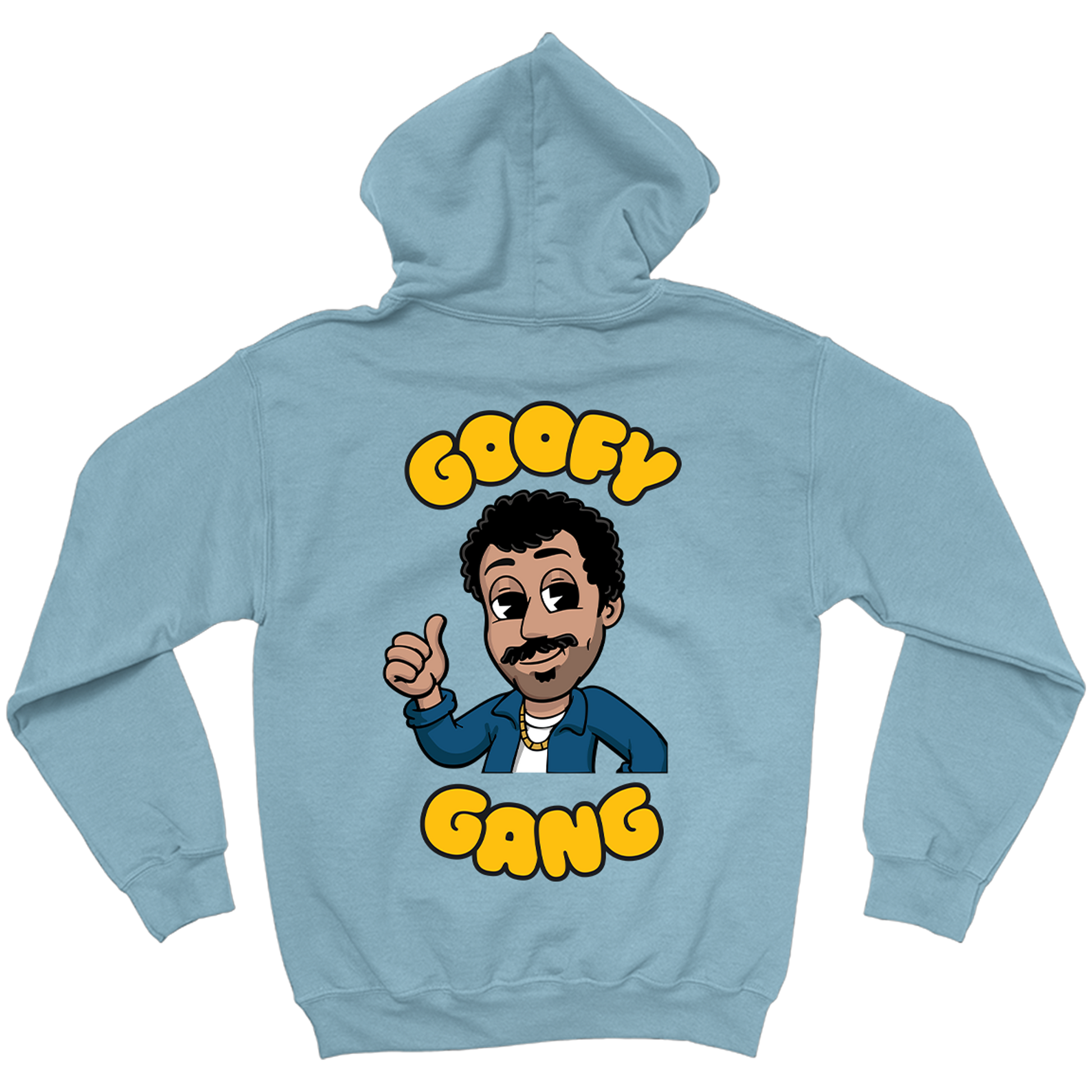 Light blue drawstring hoodie with golden drawstring cords featuring Goofy Gang logo on front left chest and Goofy Gang graphic on back.